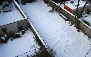 I can't help but wonder if the person who made this gigantic snow sculpture had to keep lifting up their foot to look at their own boot and see if they were doing it right. I can imagine the conversation (with them-self, that is) going like this: "Hmmm... now if I jump two feet to the left and go three steps, I'll make the first part of this little diamond piece. Boy, this is a lot more fun than studying for my Geography quiz!"